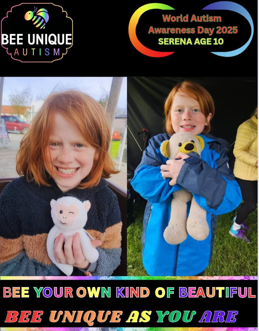 My name is Serena and I am 10 years old. I am autistic, happy, smiley, sensitive, quiet, kind and caring. Cuddles comes everywhere with me and waits patiently in the car for me when I attend school.